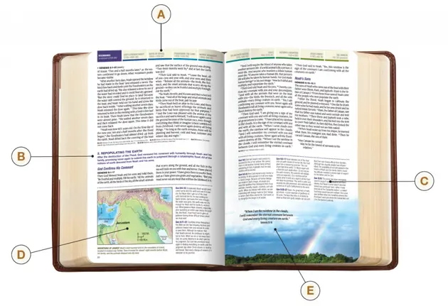 Brief paragraphs below each main head and subhead summarize the content of the following Bible text and offer important contextual information.