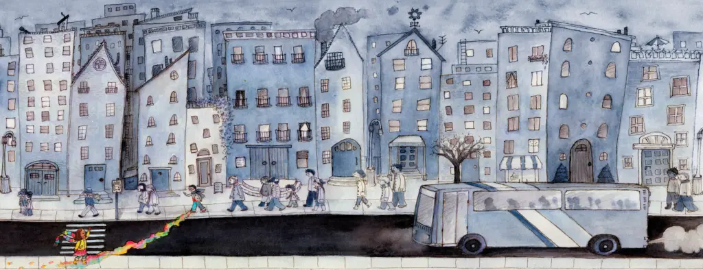 Shine is the charming, wordless story of eight-year-old Mia, whose love and joy flow from her in beautiful, swirling color. Each day she walks through the dreary, cheerless city, but as Mia shares her love with the people she encounters, the city slowly transforms until everything around her is glowing with vibrant color.