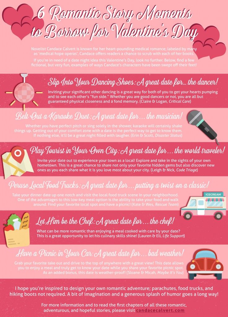 Author Candace Calvert is known for her heart-pounding medical romance novels. If you need ideas for dates this Valentine’s Day, take a look at these fun examples of how Candace’s characters have been swept off their feet!